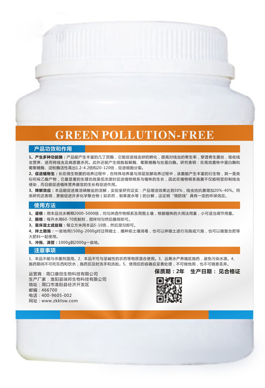 产品功效和作用 1、产生多种功能酶:产品能产生丰富的几丁质酶,它能促进线虫卵的孵化,提高对线虫的寄生率,穿透寄生菌丝,吸收线虫营养、进而将线虫及病原菌杀死。此外还能产生细胞裂解酶、葡聚糖酶与丝蛋白酶。研究表明:在高效菌株中蛋白酶和葡聚糖酶、淀粉酶活性高出1.2-4.2倍和20-120倍,促进细胞分裂。 2、促进植物生:长在微生物菌的培养过程中,在特殊培养基与深层发酵培养过程中,该菌能产生丰富的衍生物,其一是类似吲哚乙酸产物,它最显著的生理功效是低浓度时促进植物根系与植株的生长,因此在植物根系施菌不仅能明显抑制线虫侵染,而且能促进植株营养器官的生长有促进作用。 3、降解效应:本品能促进难溶磷酸盐的溶解,实验室研究证实:产品增溶效果达到30%,线虫拮抗菌增加20%-40%。同类研究还表明,更能促进许多化学聚合物(如农药,制革废水等)的分解,这证明“微防线”具有一定的环保效应。